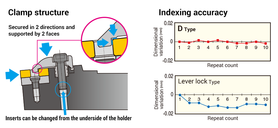 ● Stable clamping improves fracture resistance of the insert.